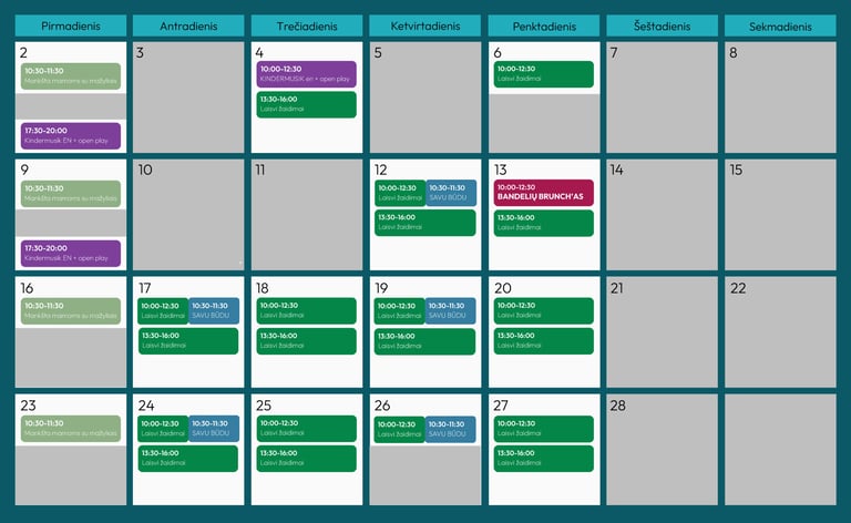 Kviečiame šeimas su mažyliais į įvairius susitikimus mūsų žaidimų kambaryje! Į kiekvieną susitikimą reikalinga registracija.
