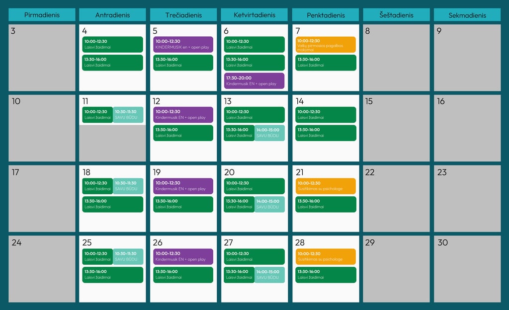 Kviečiame mamas ir tėčius su mažyliais iki 4 metų į įvairius susitikimus mūsų žaidimų kambaryje. Visus einamąjį mėnesį vykstančius susitikimus - užsiėmimus, renginius, susitikimus su specialistais bei laikus laisviems apsilankymams galite matyti žemiau esančiame tvarkaraštyje!