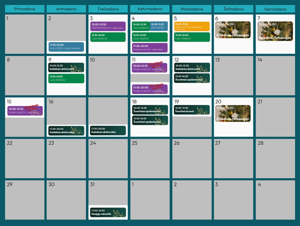 • Gruodžio mėn. vietoj užsiėmimų vyks kalėdiniai renginiai