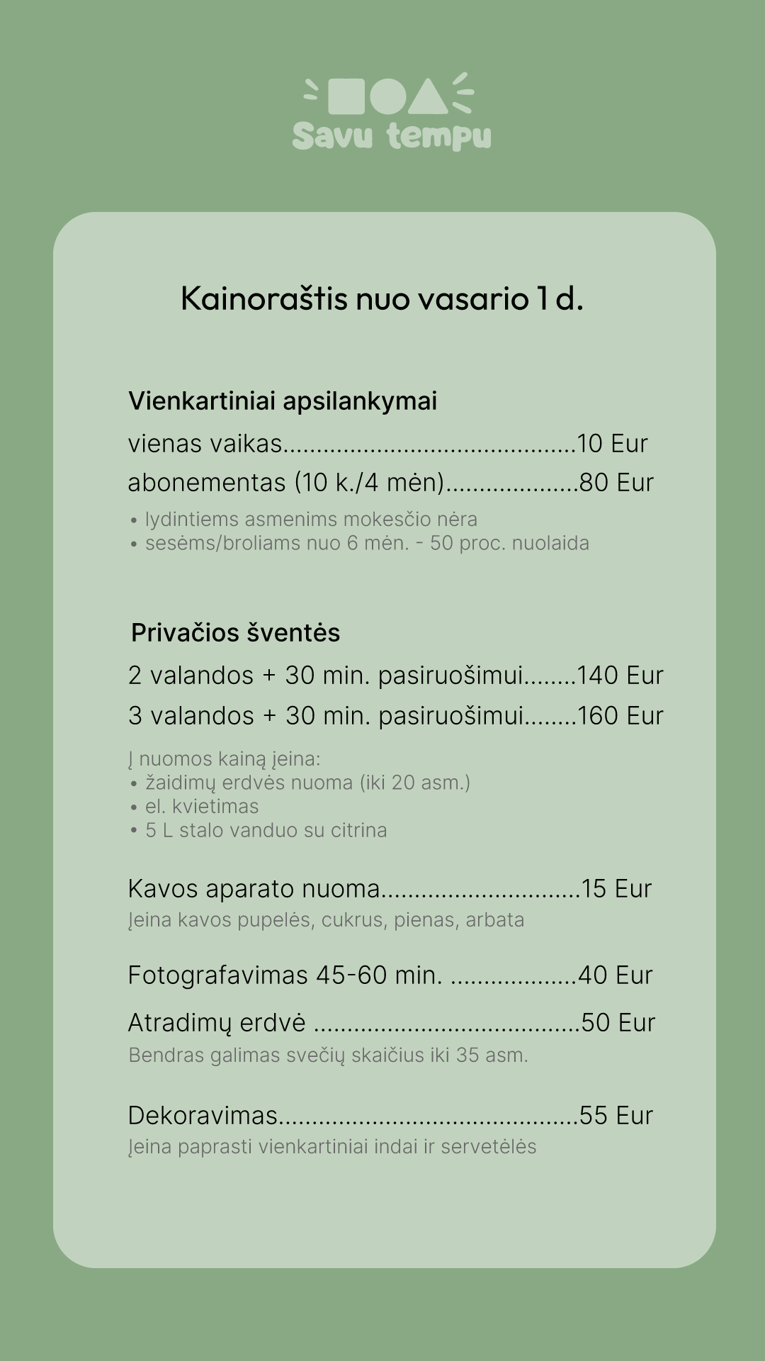 *Kainа taikomа mažyliams nuo 6 mėn. amžiaus. Jei atvykstate su dviem vaikais, iš kurių vienas yra iki 6 mėn. amžiaus (dar neropoja, nešliaužioja) - taikoma 1+1 apsilankymo kaina (7 Eur).