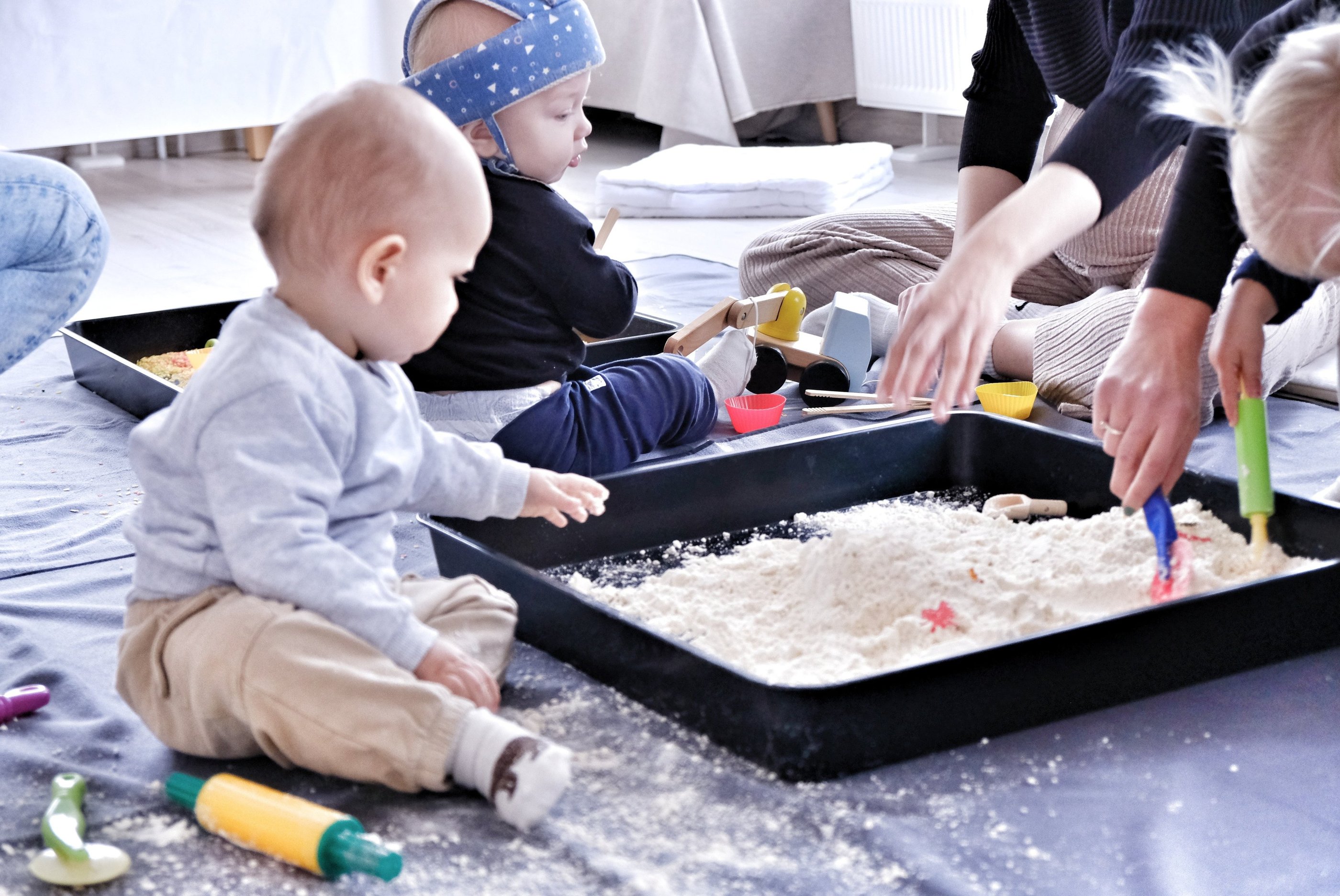 Sensorinė dalis (~30 min.) – 2 padėklai su skirtingomis priemonėmis: kruopos, ankštiniai, miltai, vanduo, žaislai ir kitos priemonės laisvam vaikų tyrinėjimui.