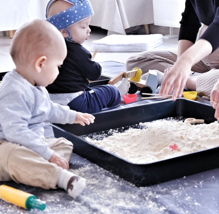 Įvairios sensorinės priemonės – kruopos, sėklos, miltai, vanduo, spalvoti įrankiai ir žaislai. Vaikai gali patys pasirinkti, ką liesti, ką semti ar tiesiog stebėti. Visos naudojamos priemonės yra saugios vaikams, pritaikytos jų tyrinėjimui.