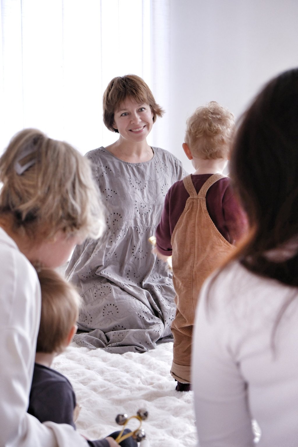 At the classes of Kindermusik we sing, dance, bounce, explore polarities through body and movement, play musical instruments, play vocal and finger games, learn to relax, read books, and just have fun and learn to be creative altogether.