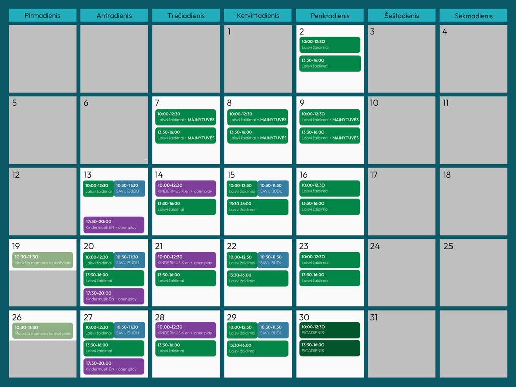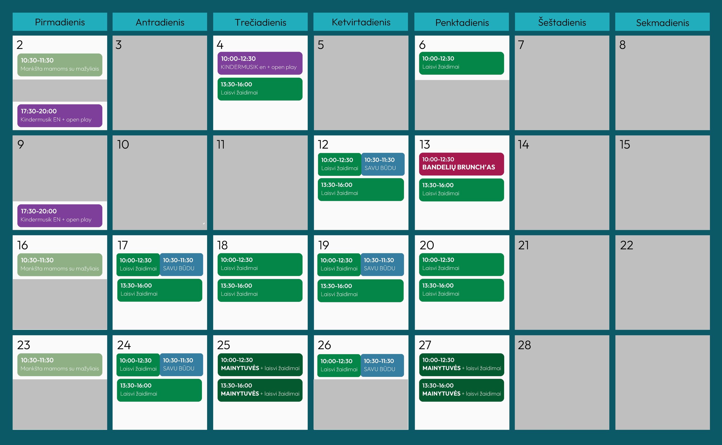 Kviečiame mamas ir tėčius su mažyliais iki 6 metų į įvairius susitikimus mūsų žaidimų kambaryje. Visus einamąjį mėnesį vykstančius susitikimus - užsiėmimus, renginius, susitikimus su specialistais bei laikus laisviems apsilankymams galite matyti žemiau esančiame tvarkaraštyje!